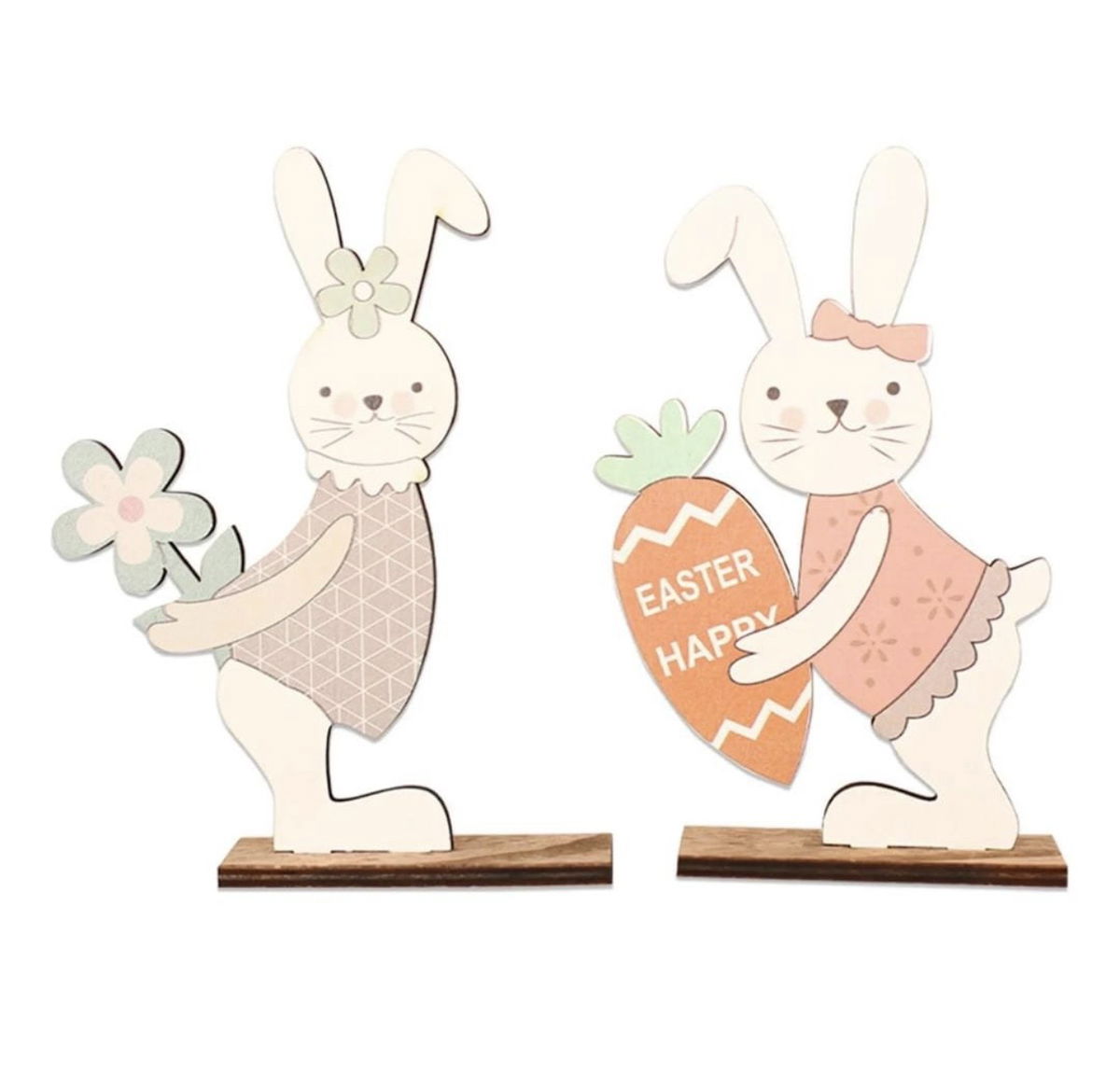 Sumá un toque tierno y elegante a tu decoración de Pascua con este hermoso set de conejitos de madera con base 🐰✨