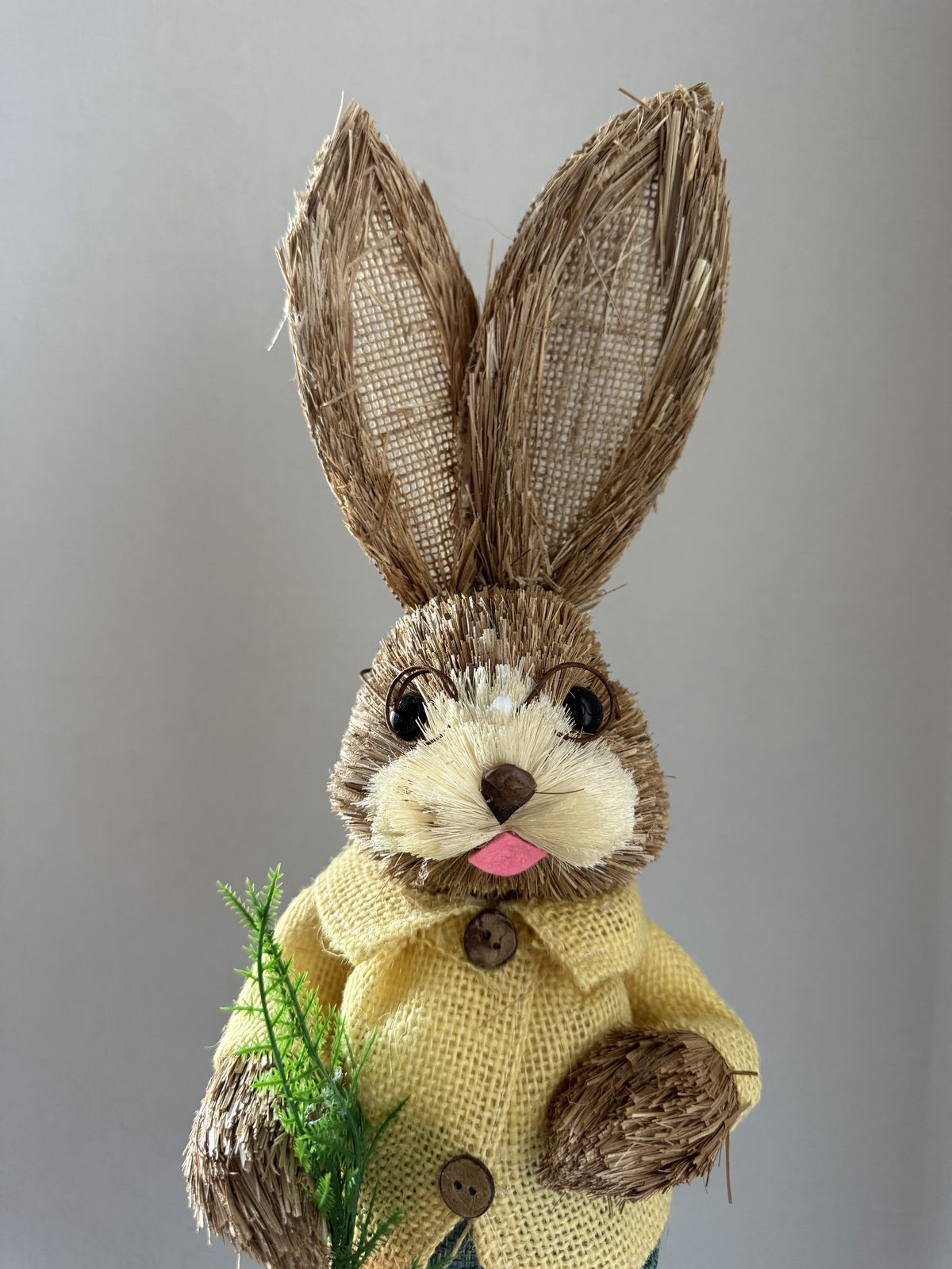 Conejo decorativo de Pascuas modelo Conejo saquito amarillo con zanahorias y lentes.