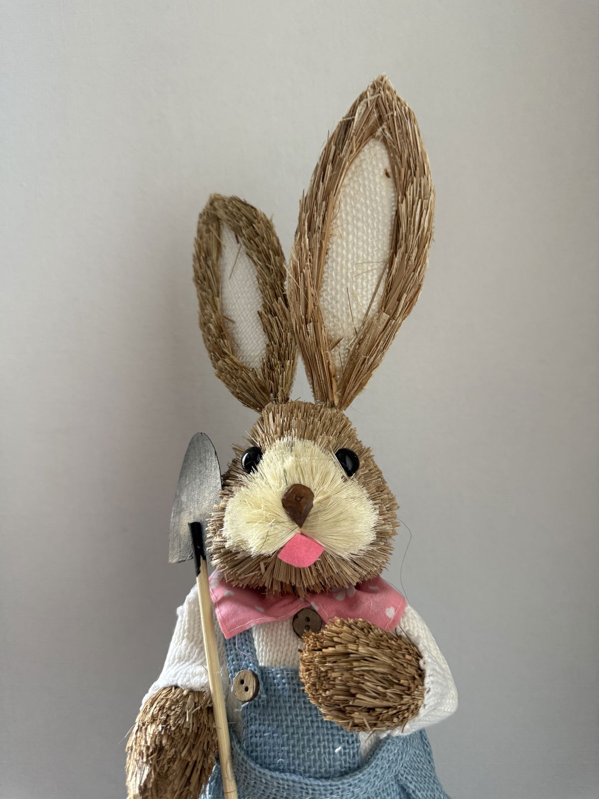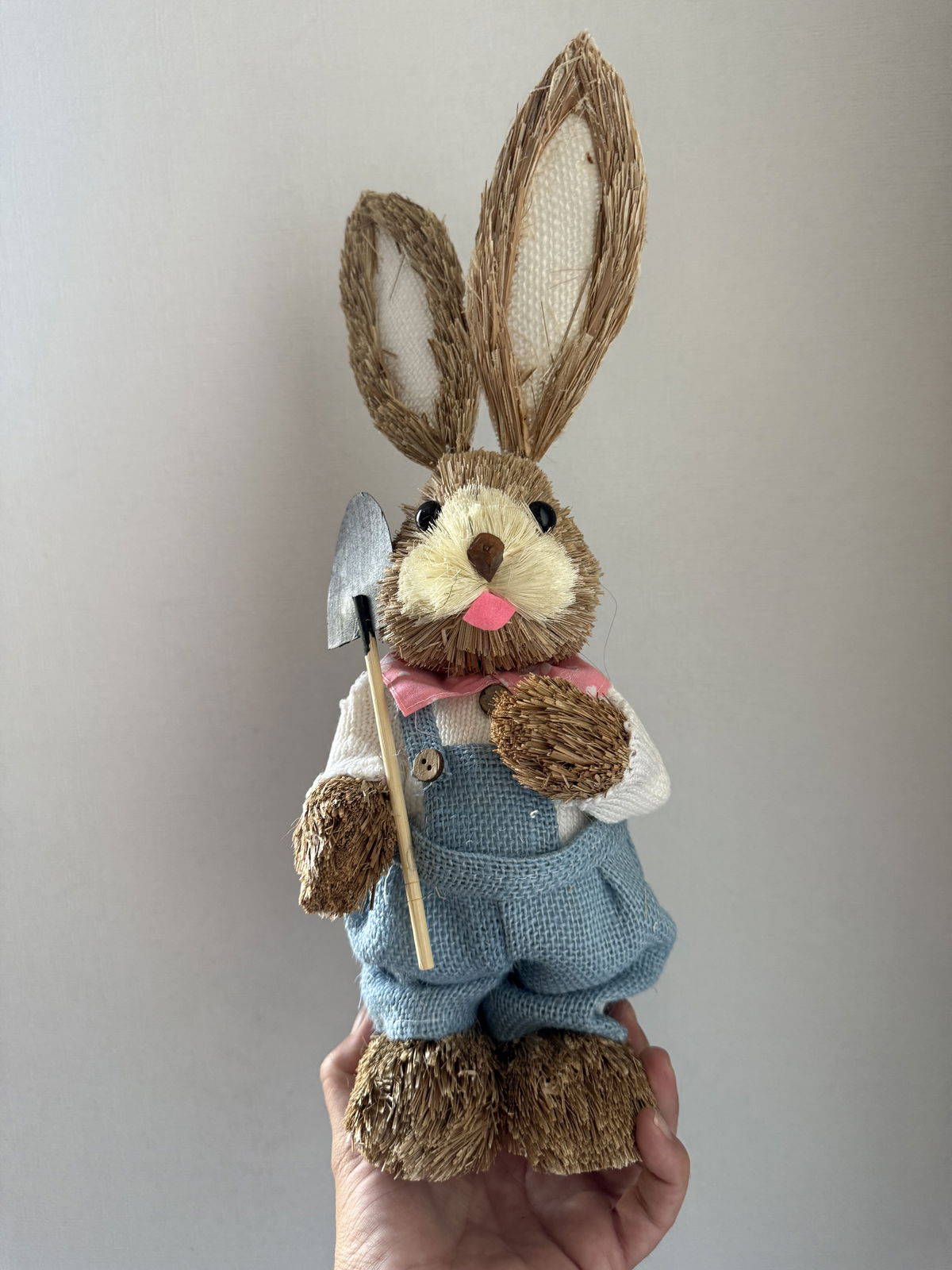 Pascuas conejo decorativo de paja , modelo pala , enterito azul.