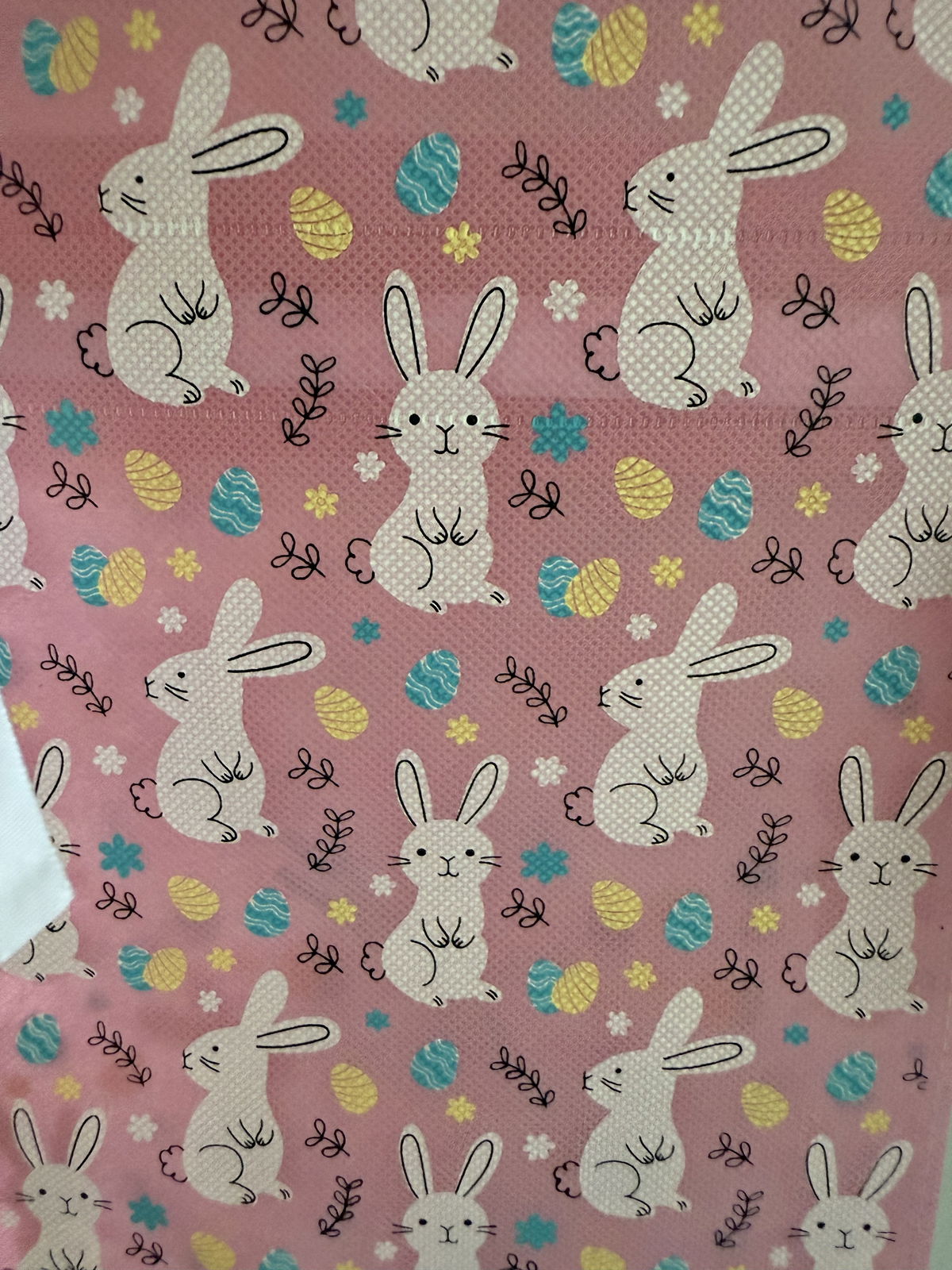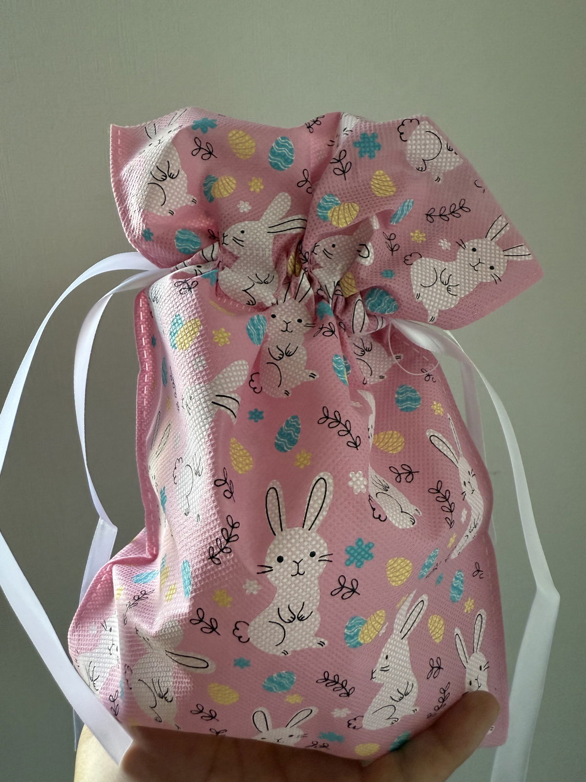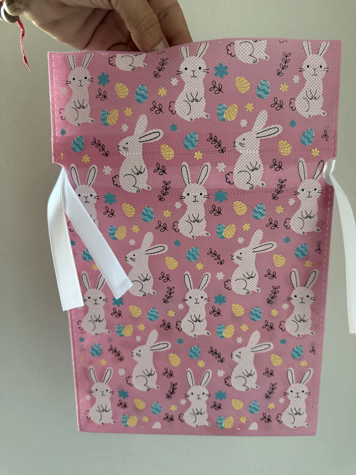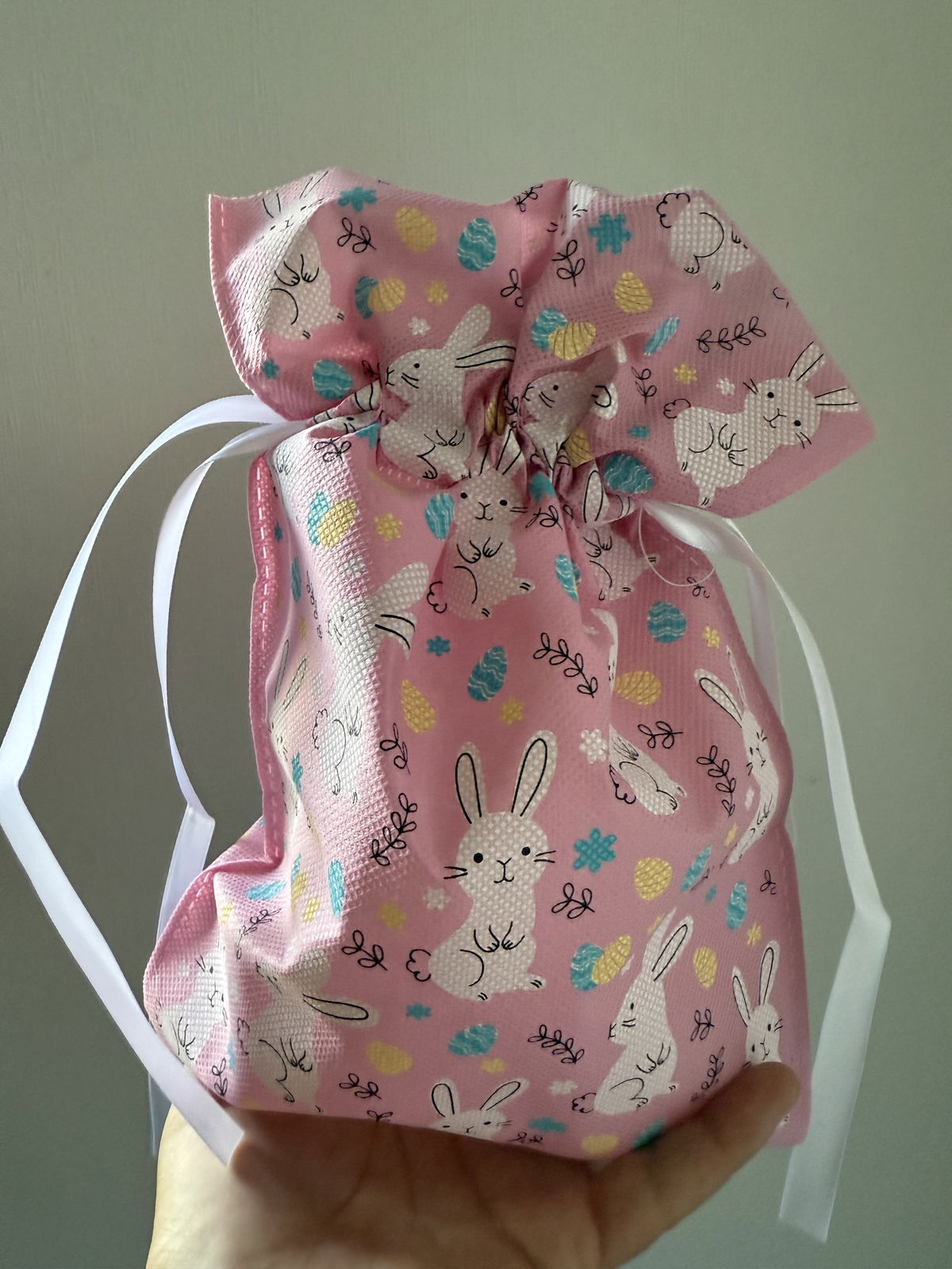 Bolsas de Fisilina decoradas para poner varios huevitos o uno solo . Contienen etiqueta de/ para y cintas de raso para cerrar . Modelo Conejitos