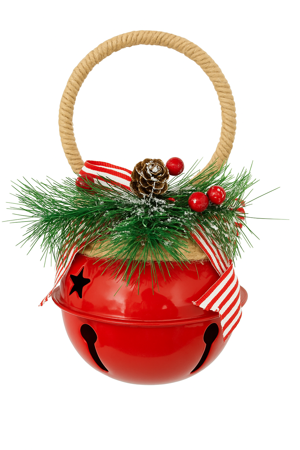 Cascabel decorativo metálico en tono rojo brillante, ideal para darle un toque festivo y acogedor a tu decoración navideña. Viene adornado con ramitas verdes, piñas, cintas rayadas y pequeños frutos rojos que aportan calidez y encanto. Su aro forrado en soga natural permite colgarlo fácilmente en puertas, árboles o rincones especiales.