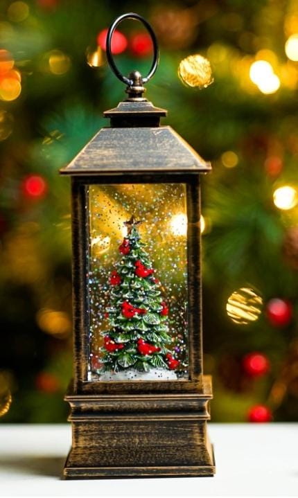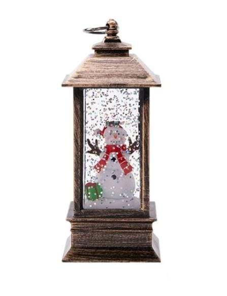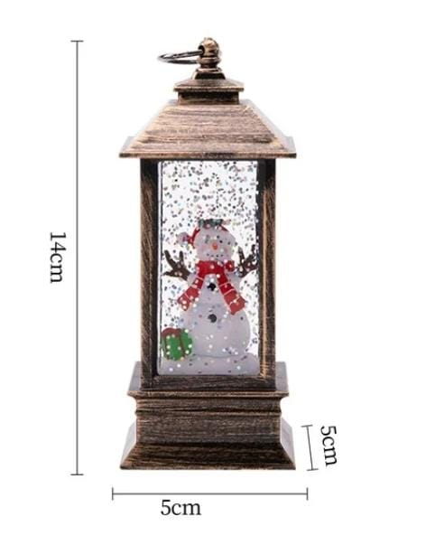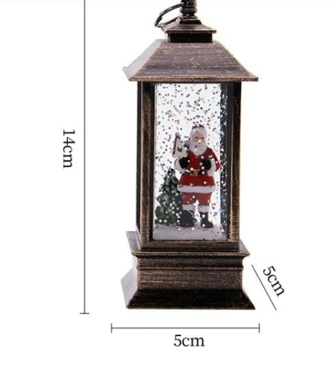 Farol decorativo navideño con diseño metálico envejecido y detalles brillantes en su interior. Cada modelo incluye una tierna escena con Papá Noel, muñeco de nieve o arbolito de Navidad, rodeados de copitos que simulan nieve. Ideal para iluminar rincones festivos, mesas o vitrinas y darle un toque mágico a tus decoraciones.