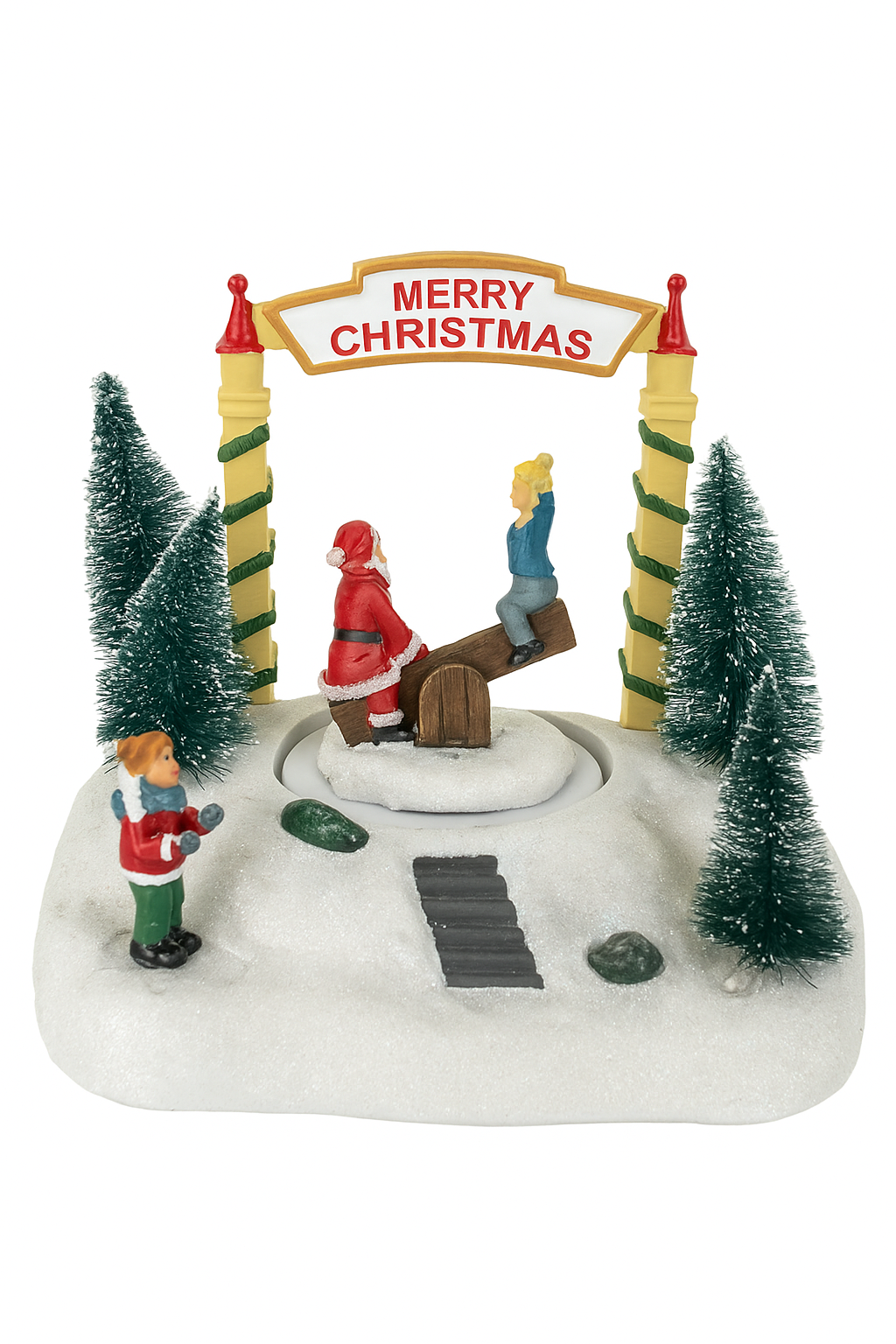 Mini villa navideña con base nevada y detalles encantadores: Santa y una niña jugando en un sube y baja, pinitos nevados y cartel de Merry Christmas. Ideal para decorar mesas, estanterías o armar una aldea navideña completa.