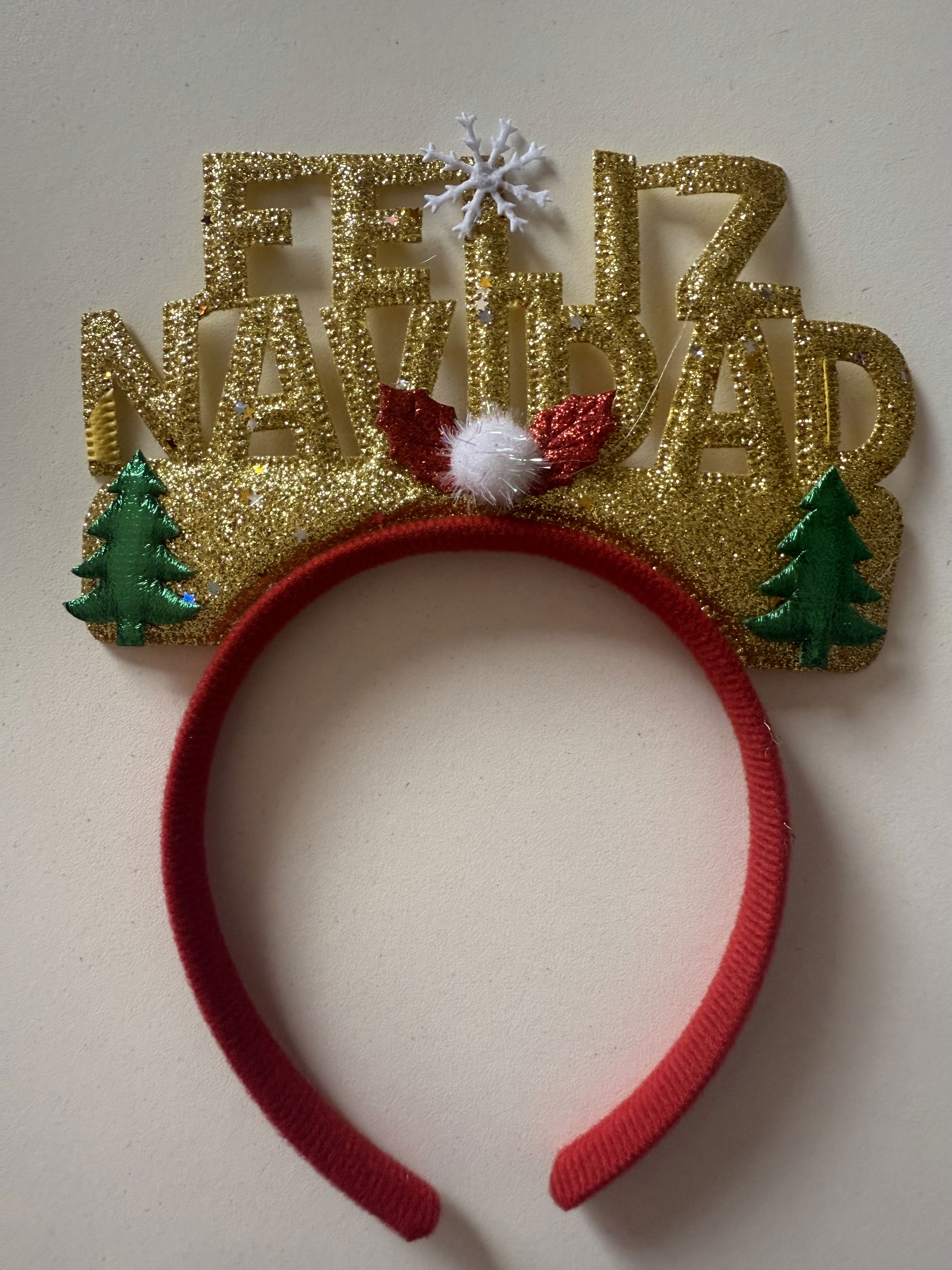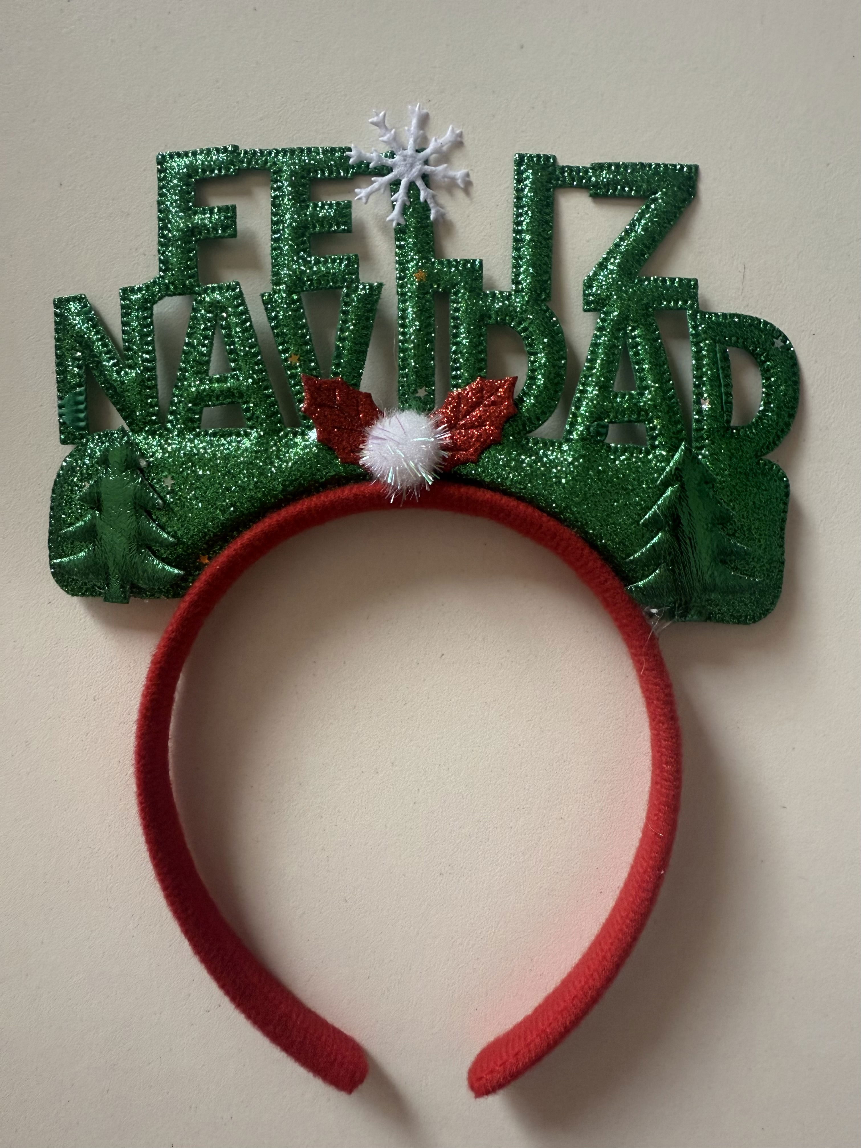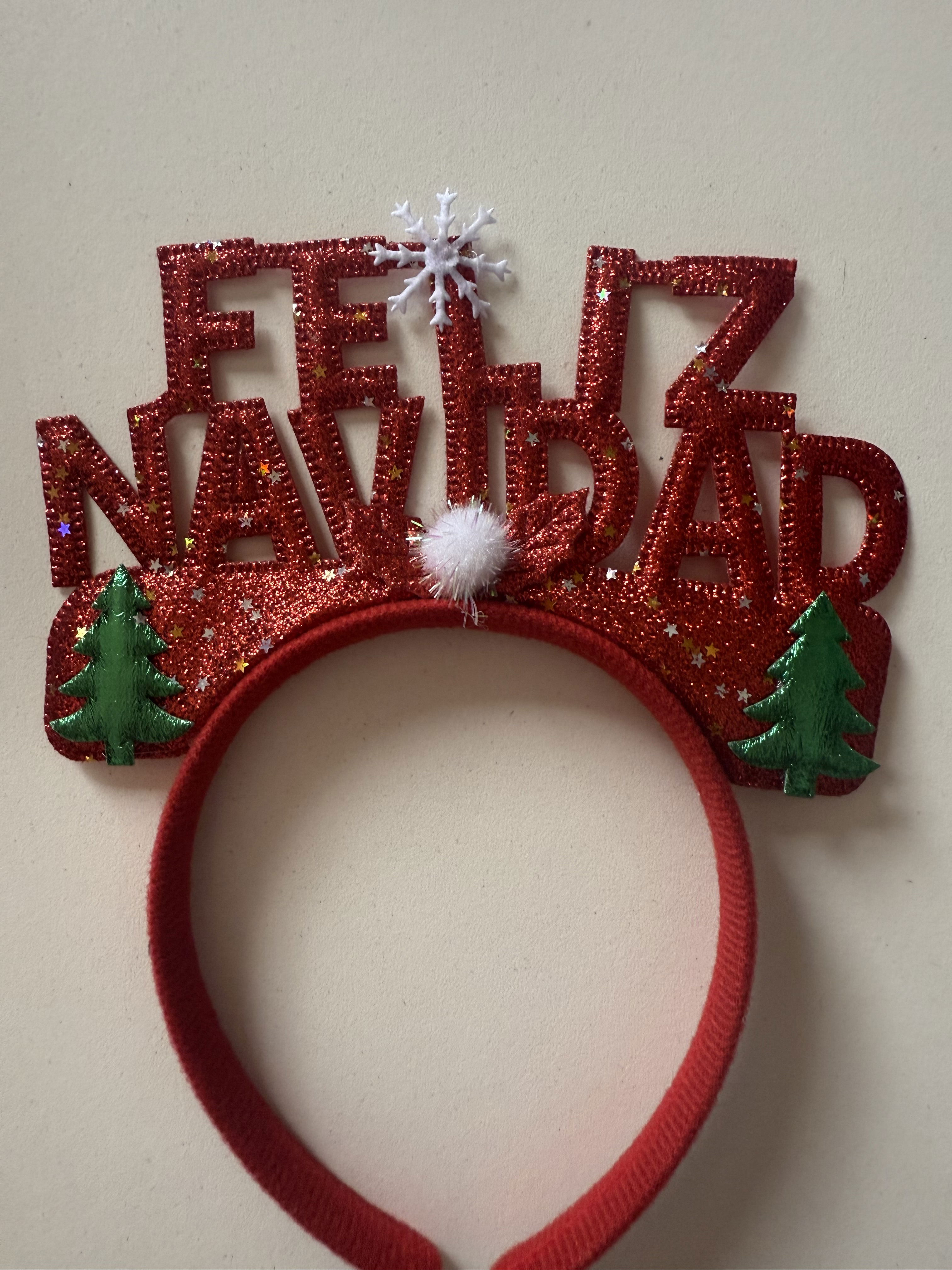 Vincha roja con letras “Feliz Navidad” llenas de glitter, detalle de pompón blanco, copito de nieve y arbolitos verdes. Súper cómoda y liviana, ideal para fiestas, eventos, fotos o para animar cualquier reunión navideña 💖