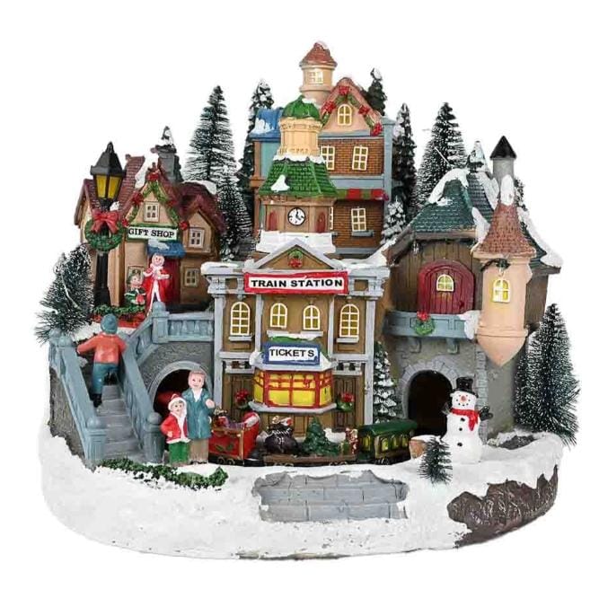 En el centro el tren gira e ilumina la escena por dentro y fuera del tune , creando un pasisaje lleno de alegría y vida .