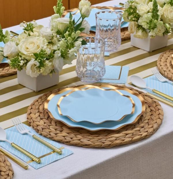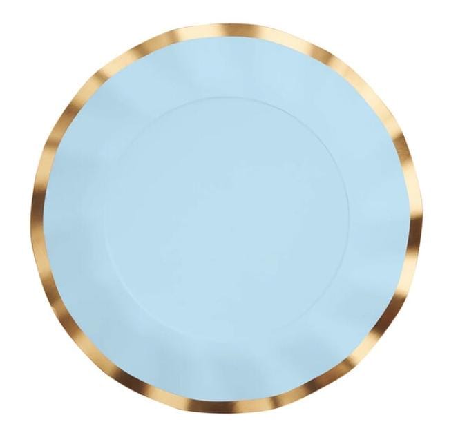 Plato de Polipapel Celeste cielo x 8, con detalles en color Oro en el borde ondeado.