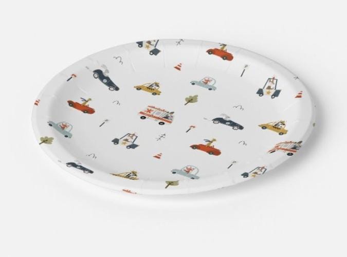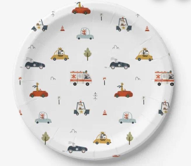 Plato de polipapel x 8 unidades con dibujos de coches t animalitos de la selva, de estilo infantil para cumpleaños o eventos temàticos.