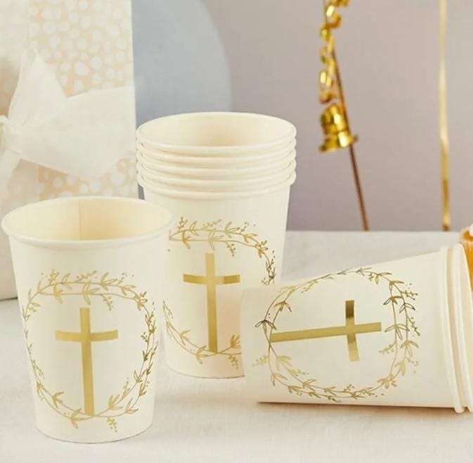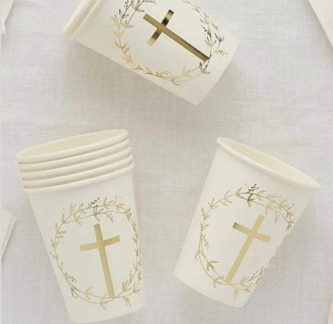 Vaso de polipapel por 8 unidades, blanco con detalles en Dorado, es ideal para festejar cualquier evento religioso, Bautismo, Comunión o Confimación.