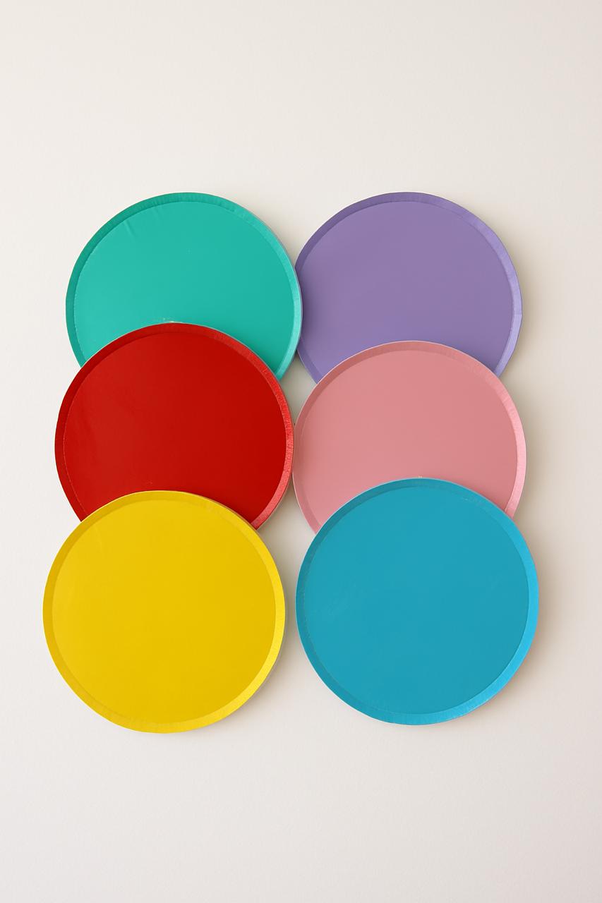 Platos decartables planos de diferentes colores.