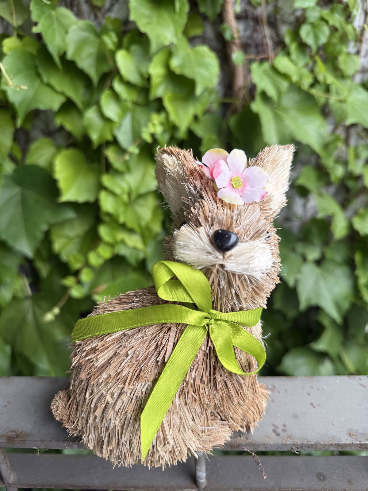 Su diseño artesanal, combinado con el moño verde y el delicado detalle floral, lo convierte en una pieza ideal para ambientar cualquier espacio con un estilo cálido y primaveral.