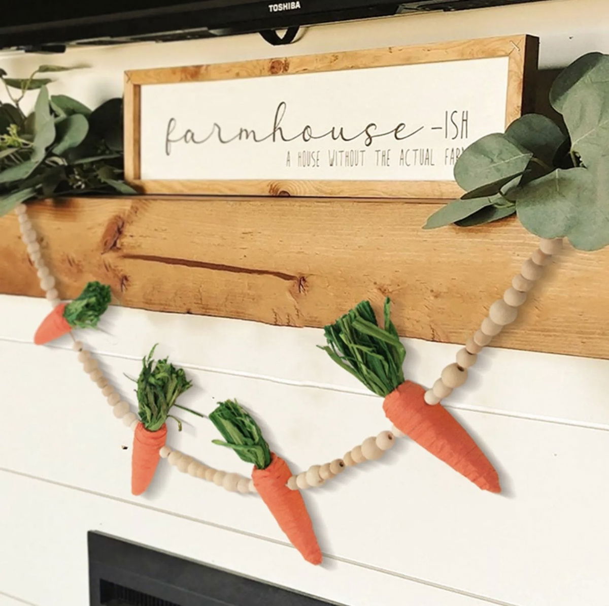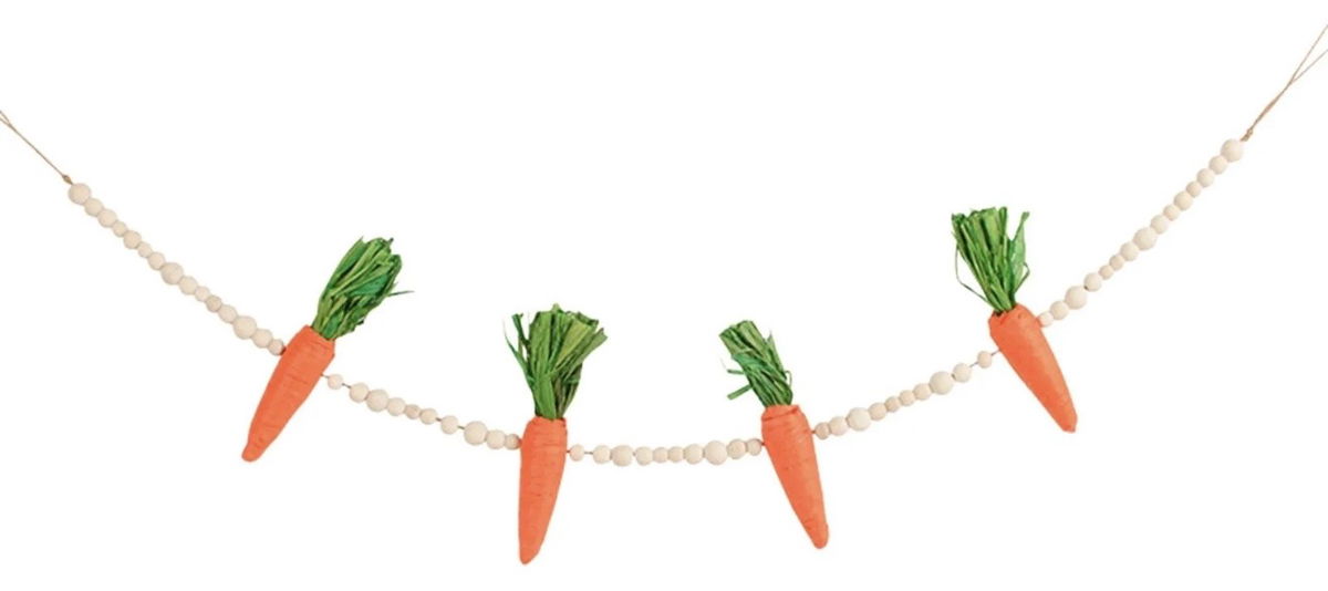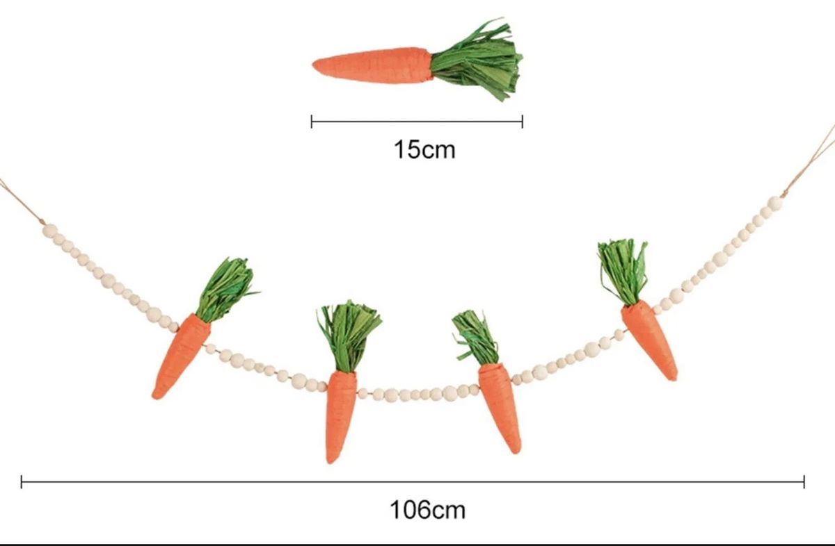 Está compuesta por pequeñas zanahorias decorativas unidas con cuentas de madera, logrando un estilo cálido y delicado que combina perfecto con ambientaciones de Pascua, temáticas campestres o deco infantil.