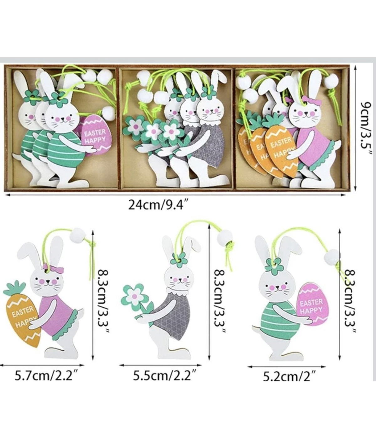 Incluye 9 piezas de madera con diseños variados: conejitos con huevo, zanahoria y flores, todos con cordón verde listo para colgar.